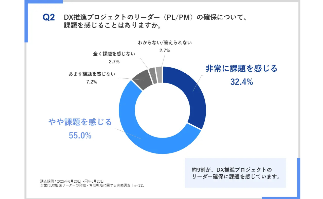 また、「DX推進プロジェクトのリーダーの確保について、課題を感じるか」との問いには、約9割が課題を感じていると回答した(「非常に課題を感じる」32.4%、「やや課題を感じる」55.0%)。これはDX推進が多くの企業で重要なテーマであるにもかかわらず、リーダー層の人材確保が十分でない状況を示している。