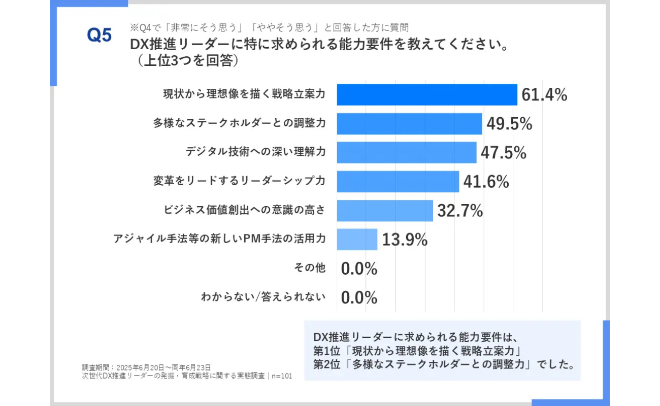 さらに、DX推進リーダーに求められる能力について尋ねた設問では、9割以上が「従来のシステム開発プロジェクトリーダーとは異なる能力が求められる」と答えている。特に、「現状から理想像を描く戦略立案力」が61.4%で最も多く選ばれ、第2位として「多様なステークホルダーとの調整力」が49.5%となった。DX推進には、単なるITやシステムだけでなく、事業全体の変革を推進する幅広い能力や、新たな方向性を描き出す力が強く求められていることが明らかとなっている。