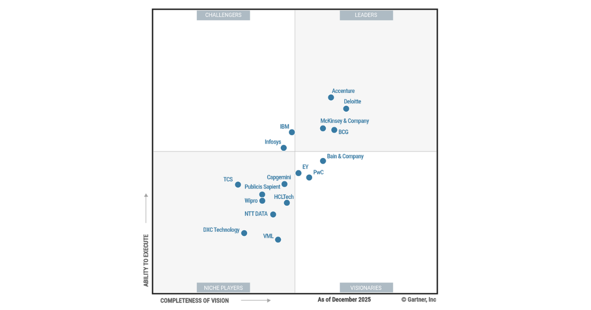 2026年1月23日、アクセンチュアは、ガートナーが発行した「Magic Quadrant for Digital Technology and Business Consulting Services」(デジタル技術およびビジネスコンサルティングサービス)において、リーダーの1社と認定されたと発表した。本レポートは、データや先端技術、ビジネス戦略を統合したコンサルティングサービスを分析対象としている。