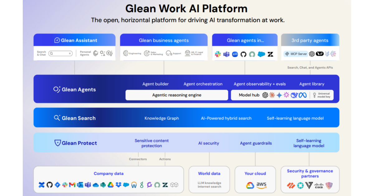 Gleanは、企業内の分散した情報を統合し、AIを活用して業務効率を向上させるエンタープライズ向けプラットフォームである。100種類以上の主要なSaaSアプリケーションとの連携により、社内データを一元的に瞬時に検索・活用できる点が特長。情報のサイロ化や、AI利活用スキルのバラつきといった企業の課題に対応し、全社的なAIネイティブな働き方の実現を支援する。