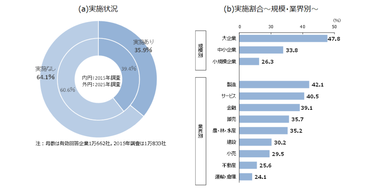 今回の調査によれば、2023~2025年の3年間にイノベーション活動を実施した企業は全体の35.9%に留まり、10年前(39.4%)より3.5ポイント減少した。企業規模別では大企業が47.8%と高い一方、小規模企業では26.3%にとどまり、規模が大きいほどイノベーションの取り組みが進んでいる傾向が明らかとなった。業界別では『製造業』『サービス業』の実施割合が4割台で高く、『運輸・倉庫』『不動産』『小売』業界などでは低水準だった。