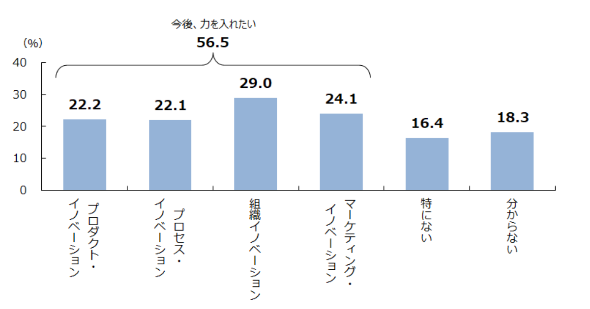 今後については、56.5%の企業がイノベーション活動に力を入れたいと考えている。特に「組織イノベーション」を重視する意識が高まっており、業務慣行や職場組織の見直し、権限移譲、社外連携といった領域で変革を進めようとする動きが見られる。