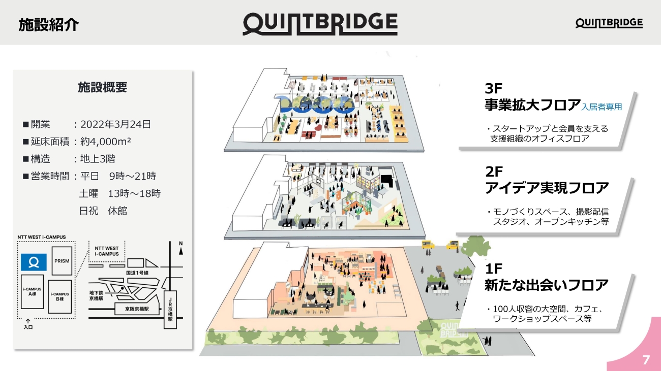 浮田(NTT西):2022年3月に、大阪の京橋にあるNTT西日本の本社敷地内に開設しました。QUINTBRIDGEの名前は、「Quintillion(100京)」と「Bridge(橋)」を合わせた造語で、「100京橋」という語呂合わせから、100以上の新規事業や社会課題解決を生み出したいという想いが込められています。