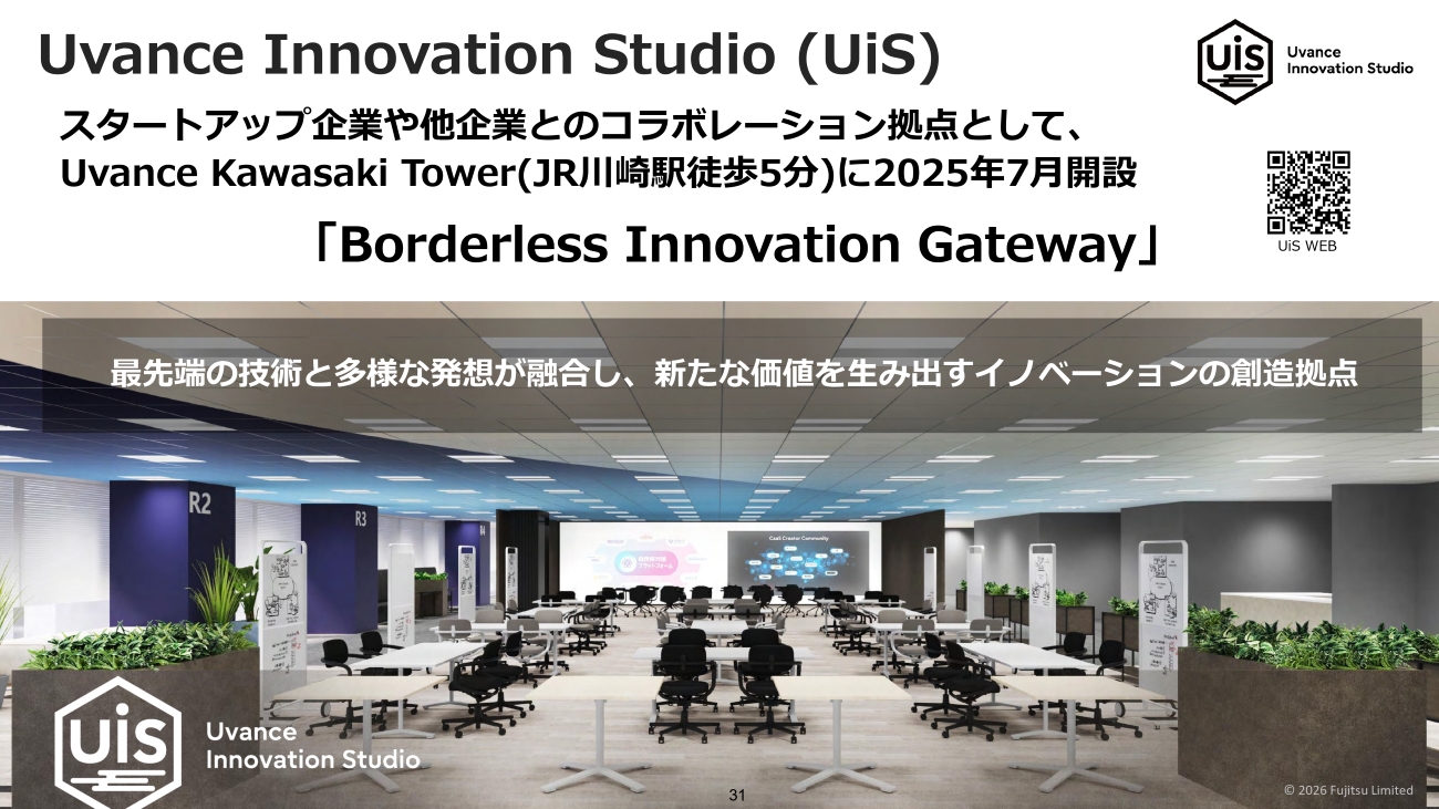浮田(富士通):FUJITSU ACCELERATORがスタートから10年経ち、スタートアップ協業実績も累計約240件となりました。これをさらに加速させるリアルな場として、2025年7月、川崎駅前のUvance Kawasaki Tower内にオープンしたのがUiSです。
