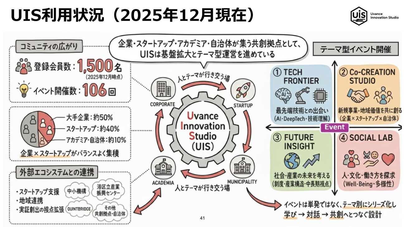 浮田(富士通):2025年12月時点で登録会員数は1,500名、イベントは1日に複数回行うこともあり、すでに106回開催しています。会員属性も大手企業とスタートアップが半々くらいで、アカデミアや自治体の方、中には川崎の市議会議員や国会議員の秘書さんなどもイベントに学びに来られています。
