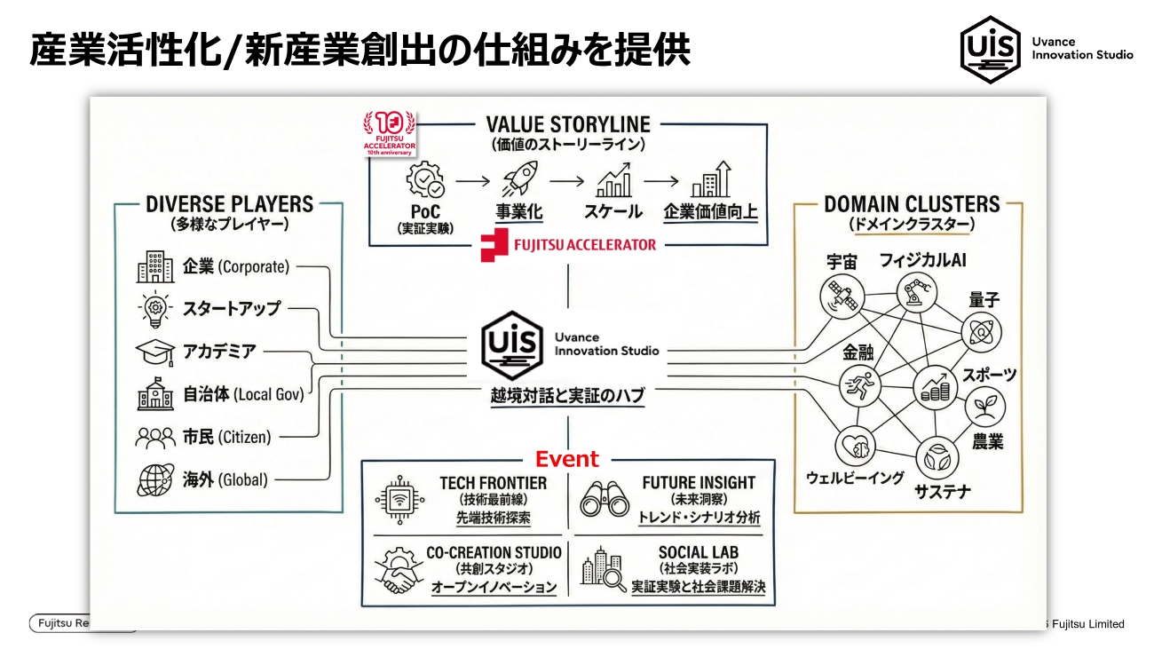 経営に対しては、UiSを多様なプレーヤーが集う「越境対話と実証のハブ」と位置づけています。ここで生まれたアイデアの中から、富士通と親和性の高いものを「富士通アクセラレーター」やCVCに乗せてスケールさせ、将来のビジネス(新産業)にしていくという価値のストーリーラインで合意形成を図っています。