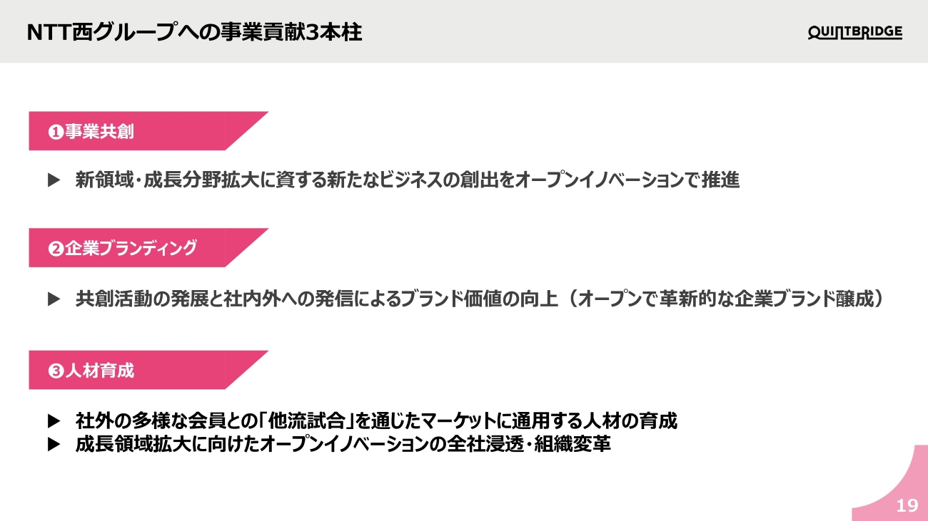 浮田(NTT西):我々はQUINTBRIDGEがグループへもたらす貢献を3つの柱で定義し、数値化して半年に1回、全役員・支店長が参加する経営会議で付議しています。