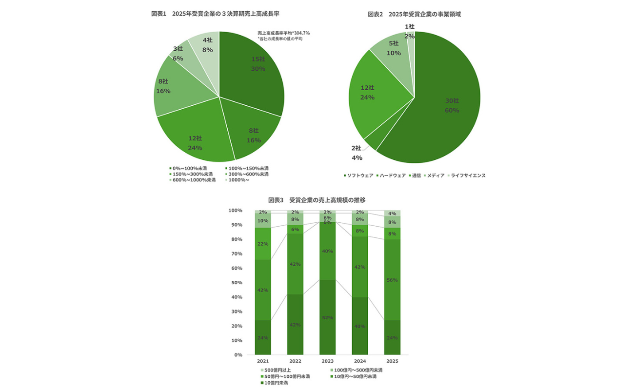業種別では、ソフトウエア関連企業が全体の60%を占めて最多となり、通信を含めると84%に達した。受賞企業の売上高規模を見ると、50億円未満の企業が全体の80%と依然として多数を占める。一方、10億円未満の企業は24%まで低下し、10億~50億円未満の企業は56%まで拡大した。50億円以上の企業も増加傾向にある。