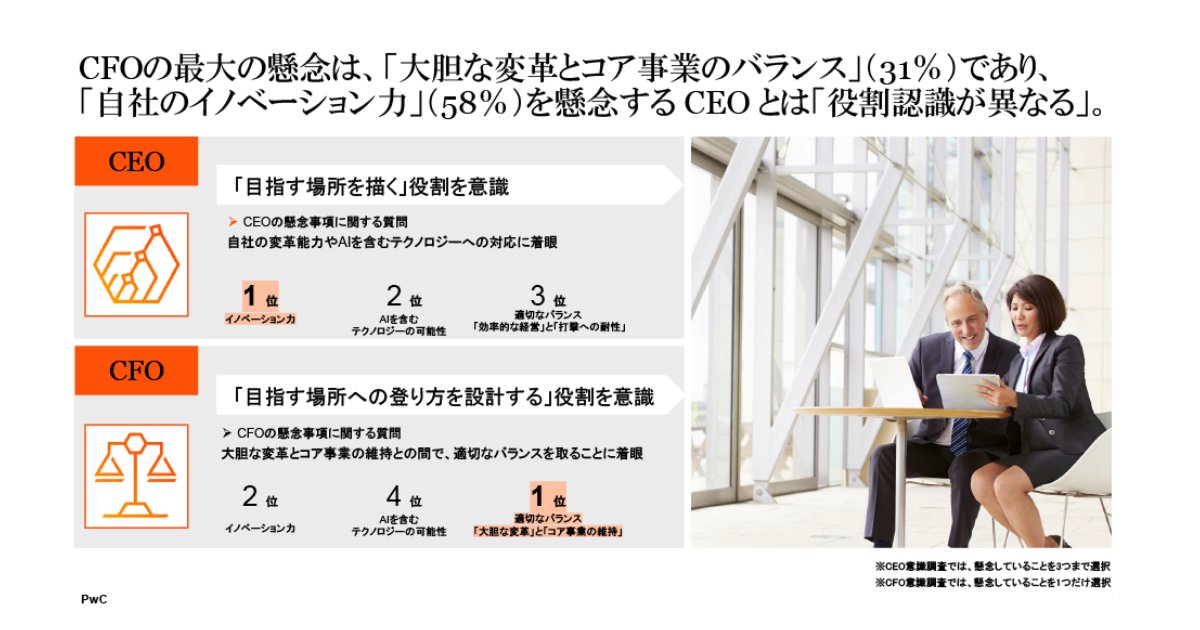 PwCが別途実施している「世界CEO意識調査」では、CEOの最大の懸念は「自社のイノベーション力」であった。一方、今回のCFO調査において、CFOが最も懸念しているのは「大胆な変革とコア事業のバランス」である。この違いについて、小林氏は次のように分析する。