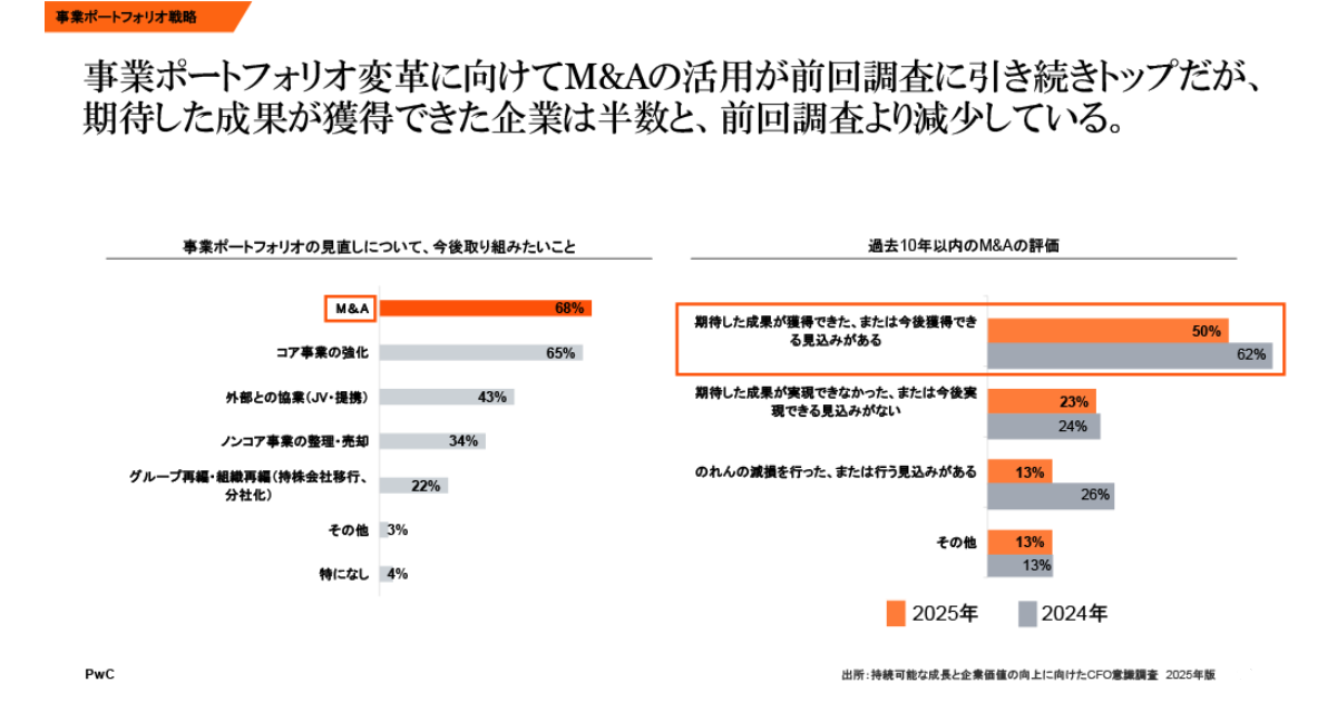 しかし、過去の買収に対して「期待した成果が得られた」と回答した企業は50%にとどまり、前年調査から減少傾向にある。その主因はPMI(買収後の統合プロセス)における価値創出の難しさにあると山口氏は指摘する。