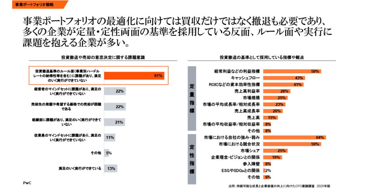 さらに注視すべきは「セルサイド(撤退・売却)」の課題だ。山口氏は「多くの企業で投資撤退のルールや基準は存在するものの、いざ実行に移す段階でブレーキがかかっています」と語る。撤退に踏み切れないことが、結果として事業ポートフォリオ全体の入れ替えを停滞させているのだ。