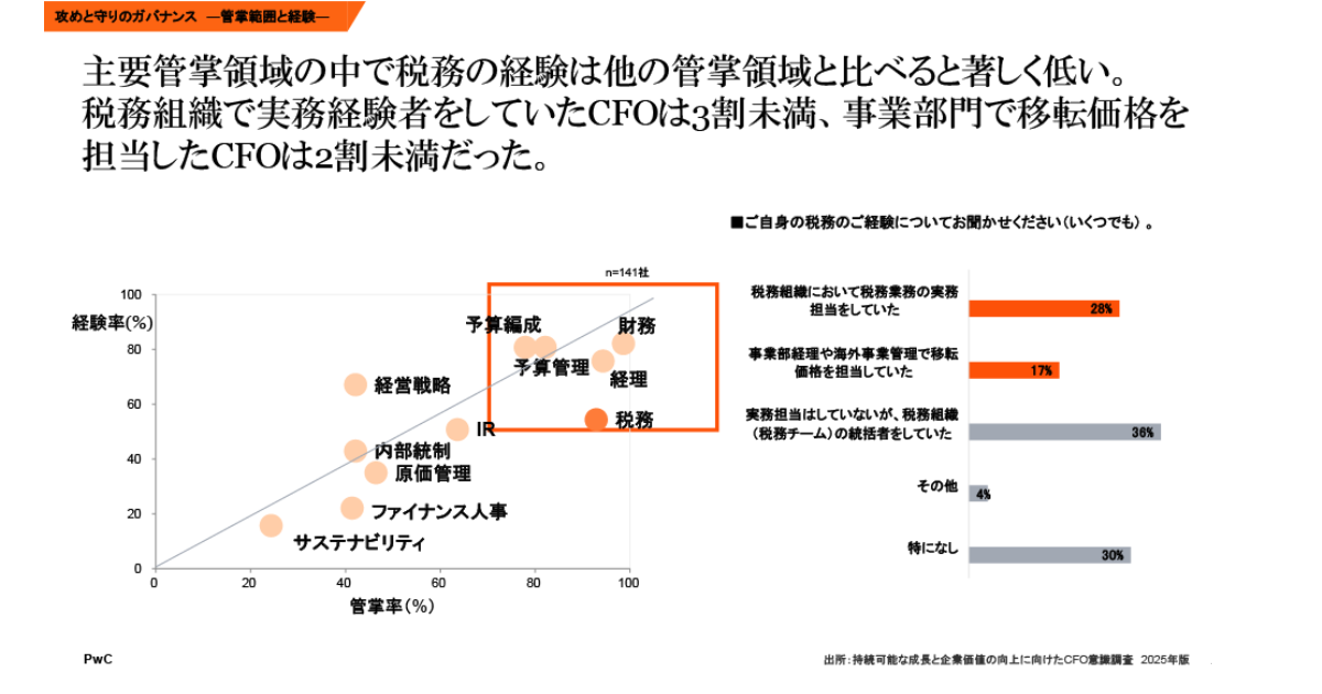 しかし、調査結果は衝撃的だった。実際に税務の実務を経験したことのあるCFOは3割に満たない。この「経験不足」が、リソース配分の誤解や、現場との温度差を生んでいる可能性があると塩田氏は分析する。一方で、税務経験があるCFOほど「コンプライアンス(守り)」を重視し、戦略的な税務プランニング(攻め)が後手になる傾向にあるというパラドックスも浮き彫りになった。