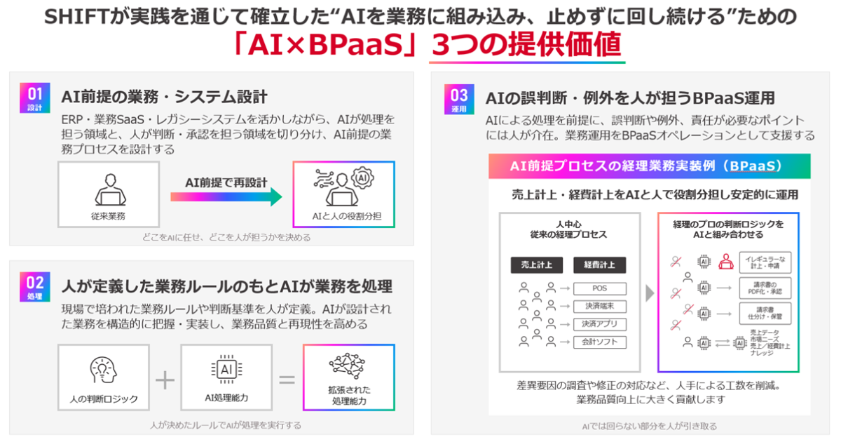 SHIFTは、AIを前提とした業務設計・運用モデルをBPaaS(Business Process as a Service)として外部提供するサービスを開始すると発表した。本サービスは、AI導入が業務変革や現場定着に至っていない企業に対し、人が業務を設計し、AIが実行し、例外や責任が必要な部分は人が引き取る「AI駆動オペレーション」を支援するスキームである。