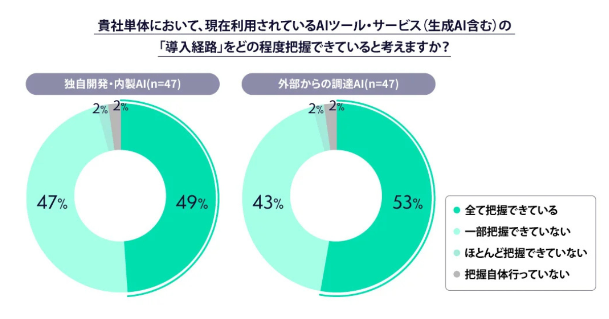 調査では、独自開発・内製AIおよび外部から調達したAIについて「全て把握できている」と回答した企業は、それぞれ49%、53%にとどまった。こうしたAIは導入プロセスに管理部門が関与しやすい傾向があるものの、約半数の企業では一部またはほとんど把握できていないという結果も得られた。管理体制が整備されていても、全社的な網羅には課題が残る状況が示されている。