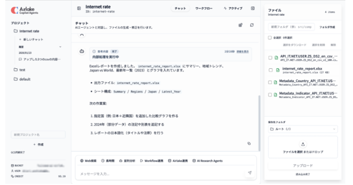 「Airlake Copilot Agents」は、これらの非構造化データを独自技術によって構造化。AIエージェントが「調べる・まとめる・実行する」を一気通貫で担い、ブラウザ作業やレポート作成など専門業務を自律的に実施する。APIのない社内システムとも既存環境のまま連携可能で、作業自動化の範囲が広がっている。さらに、外部データと社内データを組み合わせて高度な処理を行うこともできる。