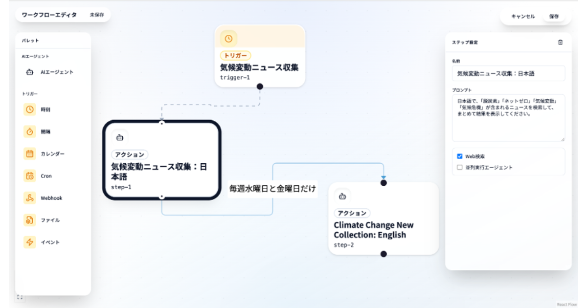 3つ目は、イベント駆動型ワークフローで、指定条件や時刻をトリガーにAIが能動的に業務を開始。例えば、朝には最新のレポートが完成しているといった自動化を実現できる。
