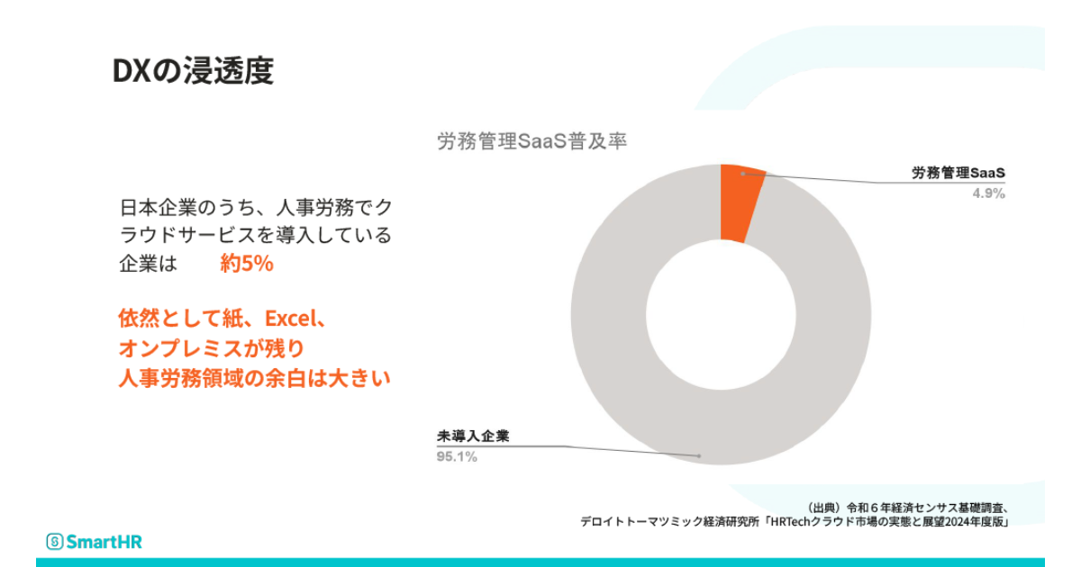 こうした議論に加え、日本市場固有の文脈も見落とせない。労務管理におけるSaaS普及率は未だ約5%に留まる。クラウド登場から10年以上経過しても、95%の企業が紙やExcel、旧来のオンプレミスシステムを使い続けている。