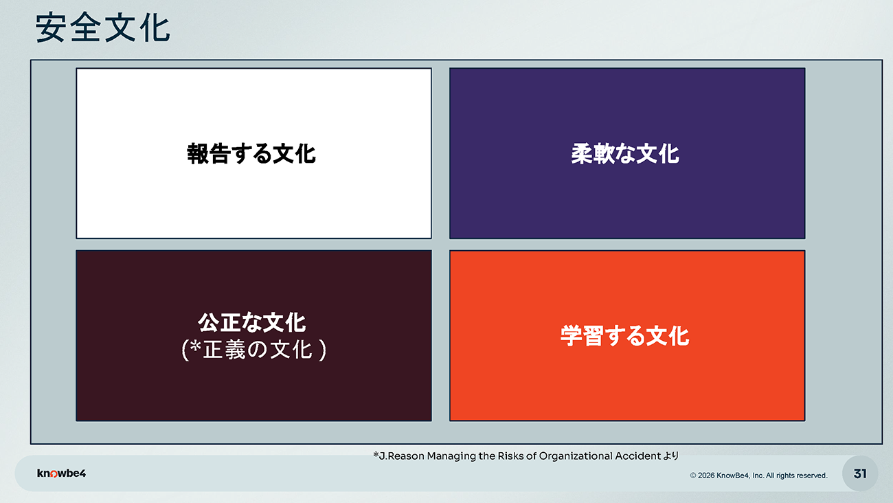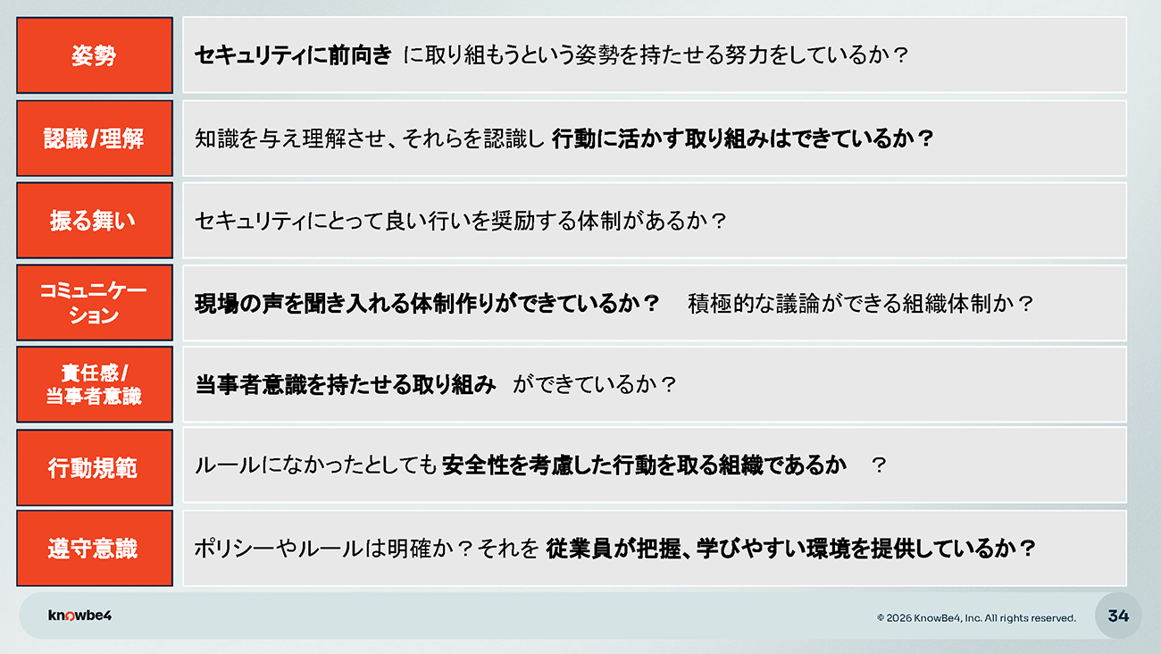 「ミスを報告しても不当に処罰されることのない公正な文化がなければ、現場のリスクは隠蔽され、取り返しのつかない事態に発展するでしょう。文化は自然発生を待つものではなく、エンジニアリングによって人為的に作り上げることができます。KnowBe4では次の7つの指標を用いて安全文化の構築を支援しています」(広瀬氏)