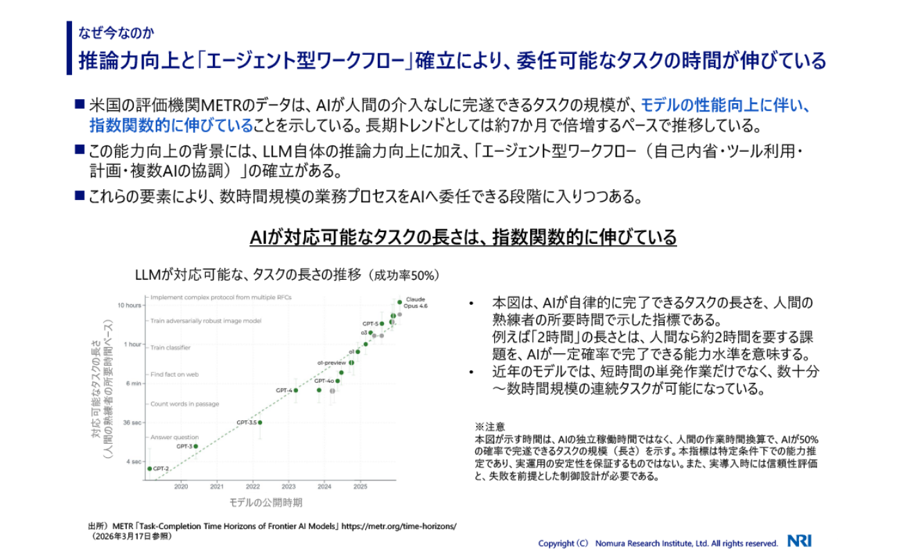 米METRのデータによれば、AIが人間の介入なしに完遂できるタスクの規模は指数関数的に伸びており、数時間規模の業務プロセスを委任できる段階に入りつつある。さらに、MCP(Model Context Protocol)などの標準プロトコルの登場により、異なるエージェント同士がシステムを跨いで協調する技術的土台も整ってきた。