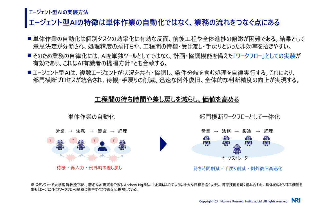 幸田氏は、単体作業の自動化だけでは工程間の待機や手戻りといった非効率が解消されず、十分な投資対効果(ROI)を示しにくいと指摘する。エージェント型AIの真価は、複数のエージェントが状況を共有・協調し、条件分岐を含む処理を自律実行する「部門横断ワークフロー」としての実装にある。