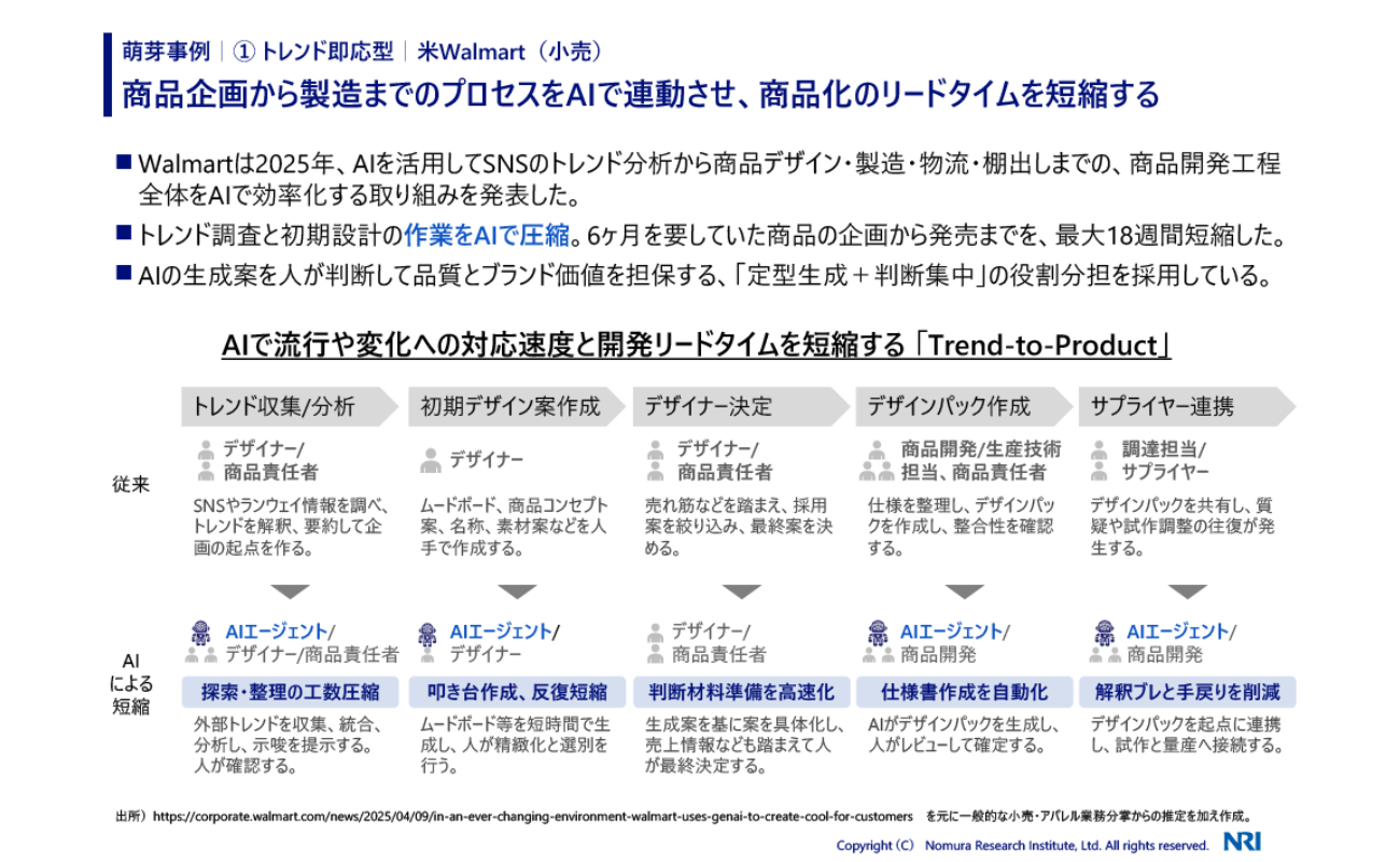 具体的な萌芽事例として、米Walmartの「トレンド即応型」が挙げられる。SNSのトレンド分析から商品デザイン、仕様書作成までを連動させ、従来6ヶ月を要していた商品企画リードタイムを最大18週間短縮した。また、米C.H. Robinson(物流)は、30以上のAIエージェントを連携させ、配送遅延などの例外対応の95%を自動化し、1日350時間以上の手作業を削減している。