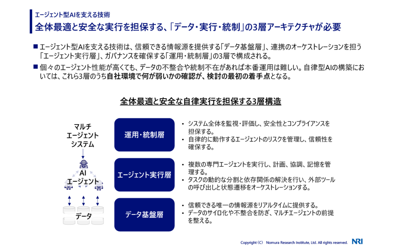 実装において重要となるのが、信頼できる情報源を提供する「データ基盤層」、連携を管理する「エージェント実行層」、ガバナンスを確保する「運用・統制層」からなる3層アーキテクチャである。個々のエージェント性能が高くとも、データの不整合や統制の欠如があれば本番運用は困難だ。検討の第一歩は、「データ基盤層」「エージェント実行層」「運用・統制層」の3層のうち、自社環境でどこが弱点となっているかを確認することにあります。