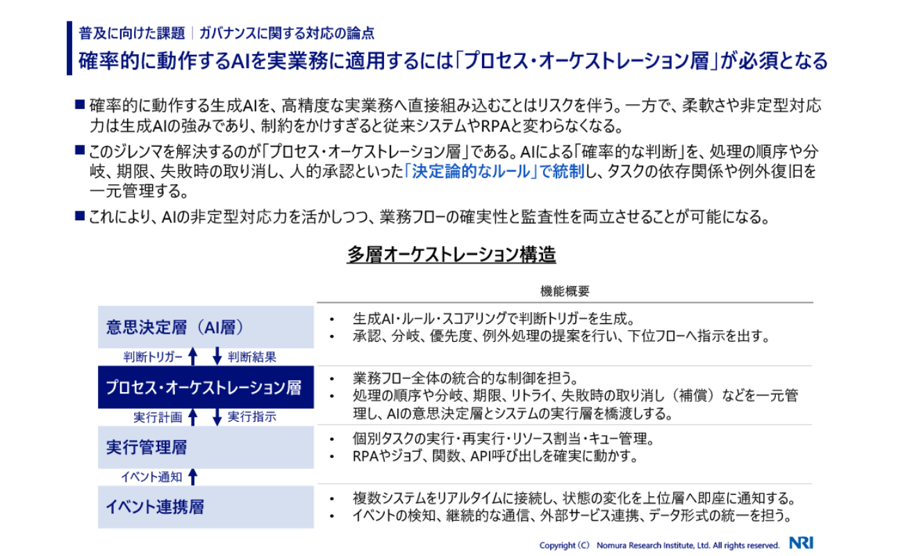 特に、確率的に動作する生成AIを実業務に適用するには、処理の順序や失敗時のリトライ、人的承認といった「決定論的なルール」で統制する「プロセス・オーケストレーション層」が不可欠となる。