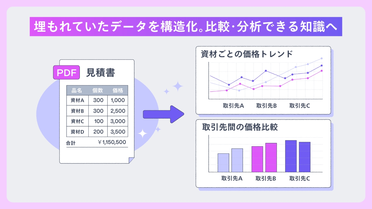 生成AIによる自動登録では、全明細が構造化データとしてシステムに取り込まれる。追加の入力コストはかかりません。結果として、これまで不可能だった明細レベルでの横断分析、たとえば資材ごとの価格トレンドや取引先間の価格比較が可能になりました。