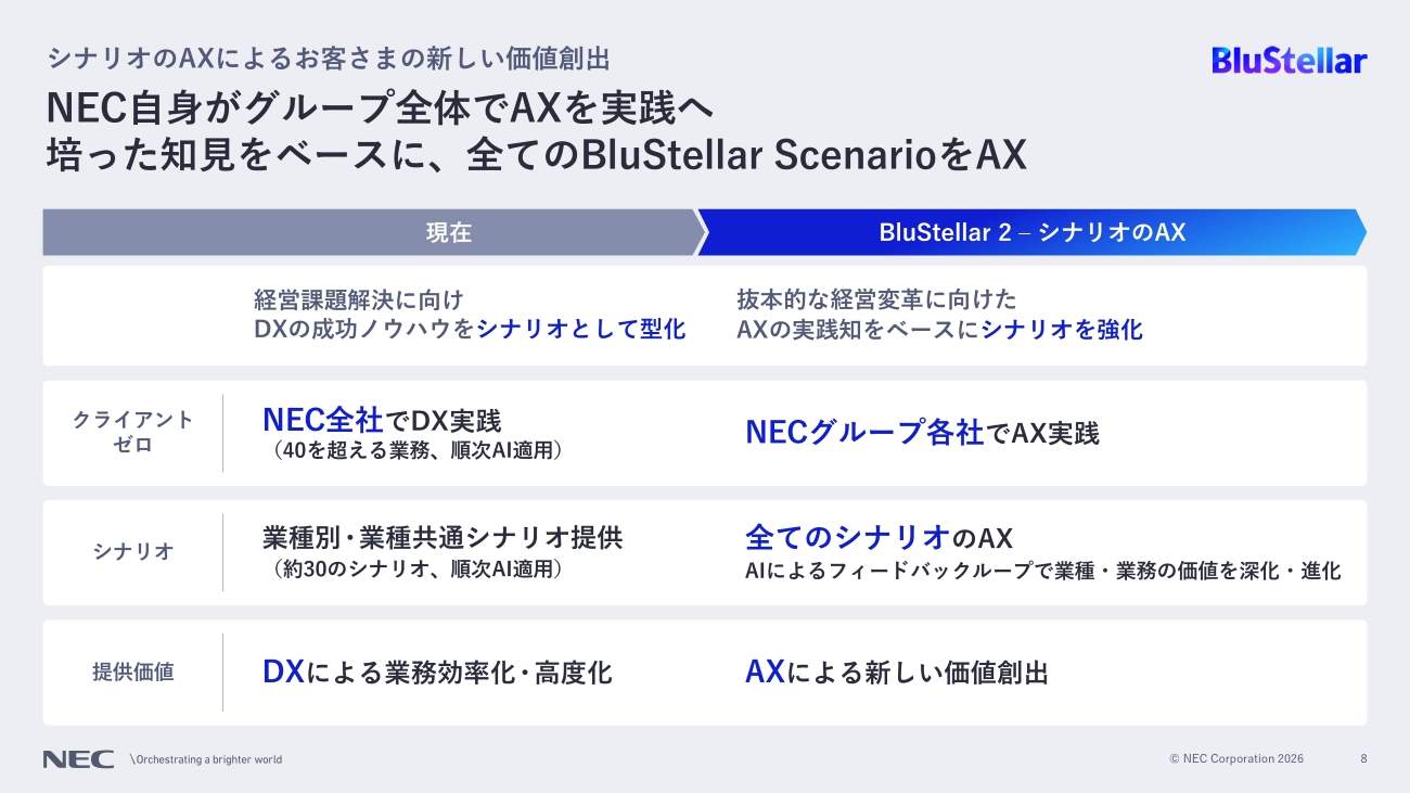 続いて登壇した木村氏は、BluStellarの推進担当として、ビジネスモデルのアップデートについて語った。木村氏が強調したのは、顧客の課題解決ノウハウを型化した「BluStellar Scenario」の全面的なAX(AIトランスフォーメーション)化である。NECはこれまで「クライアントゼロ」として社内の40を超える業務にAIを適用してきた。この実績を約30のシナリオに反映し、AIのフィードバックループを回すことで、シナリオの量と質を高めていくという。