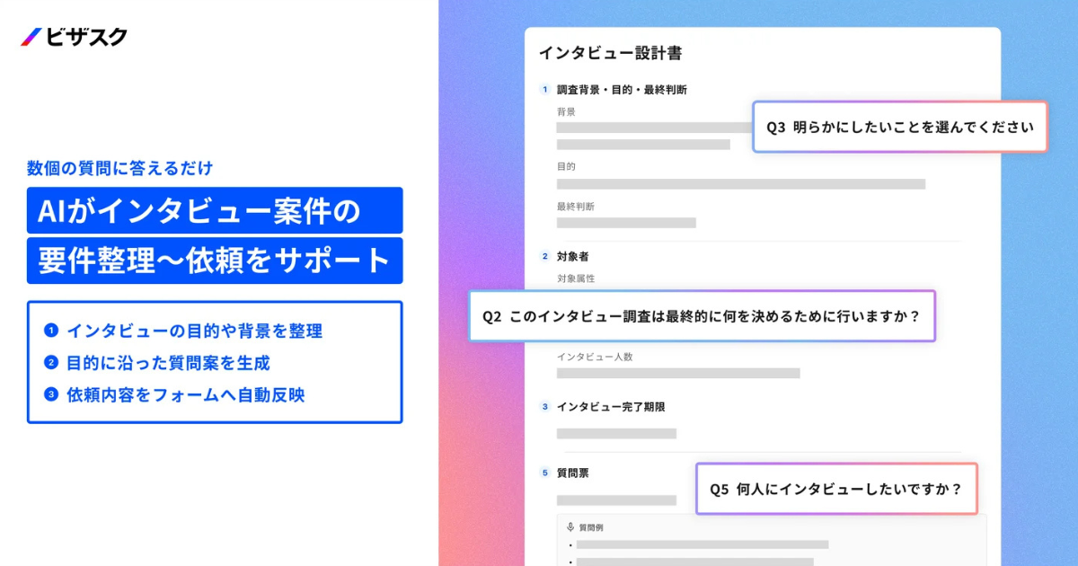 ビザスクは2026年2月26日、同社が運営する「ビザスクinterview」において、AIが専門家インタビューの要件整理と実施後の情報整理を支援する2つの新機能の提供を開始した。これにより、インタビューの準備や整理にかかる工数を削減し、得られた知見を事業の意思決定へ迅速かつ高度に活用できる環境を提供する。