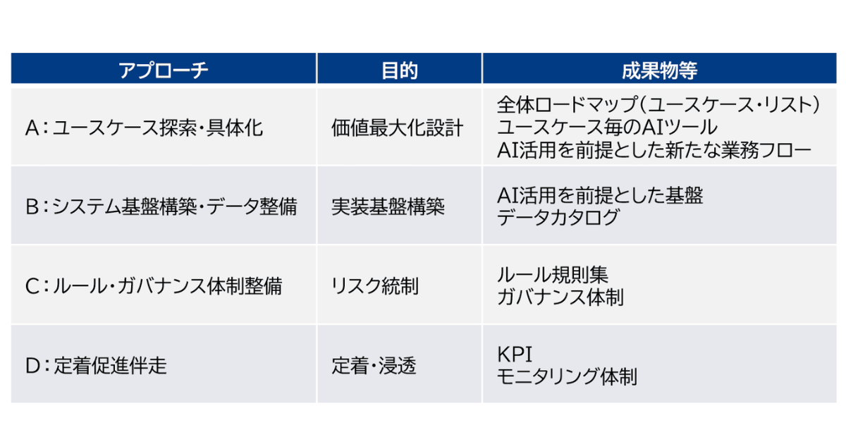 3つ目は「ルール・ガバナンス体制整備」。AI導入に不可欠なリスク管理や権限設計、品質保証などのルール策定、さらには全社的な運用ガバナンス体制も構築。組織横断でのAI活用を持続的に推進する仕組み作りを行う。