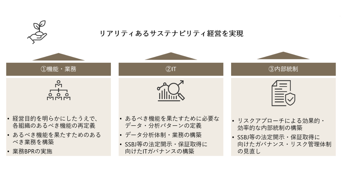 2027年3月期以降に段階的導入が進むSSBJ基準に対して、企業は開示手続や内部統制の高度化、特に第三者データや将来情報の明示が実務上の重要テーマとなっている。加えて、サステナビリティ情報を経営の意思決定や価値創出へとつなげることが不可欠となっており、部門横断での施策推進やIT活用、データ分析を通じた運用体制の整備が課題となっている。