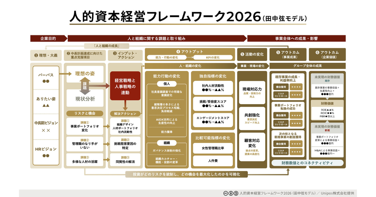 Uniposは2026年3月4日、「人的資本経営フレームワーク(田中弦モデル)」の大幅な改訂を発表した。今回の改訂は、内閣官房・金融庁・経済産業省が示した新たな人的資本可視化指針およびSSBJ(Sustainability Standards Board of Japan)基準への対応を目的としている。