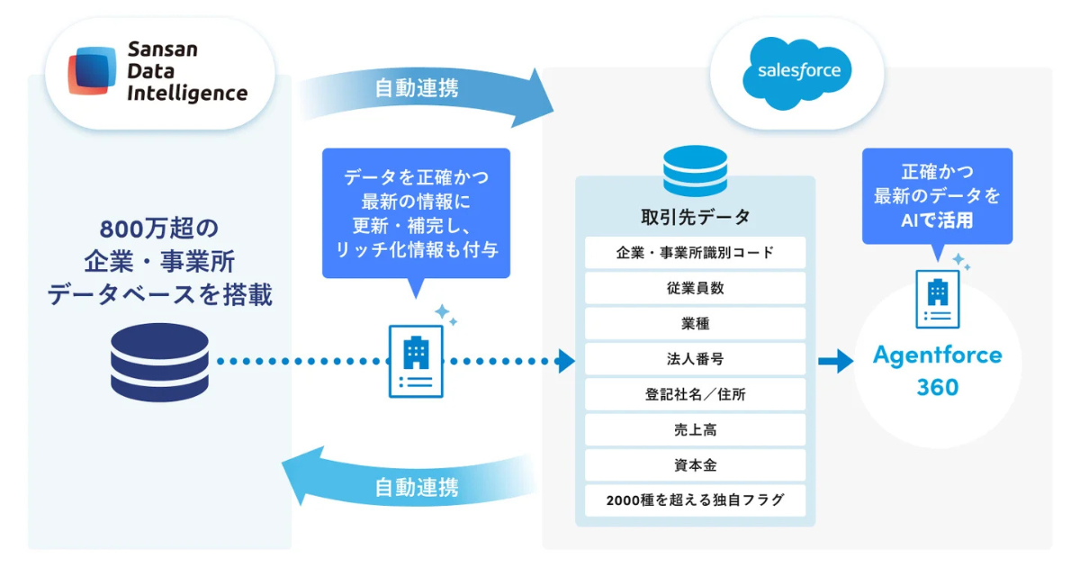 2026年3月5日、Sansanはデータクオリティマネジメントサービス「Sansan Data Intelligence」とSalesforceとの自動連携開始を発表した。これにより、Salesforceに登録されている取引先データを自動で正確かつ最新の状態に保つことが可能となる。さらに、Salesforceが提供する自律型AIエージェント基盤「Agentforce 360」などでの高度なデータ活用が行えるようになった。