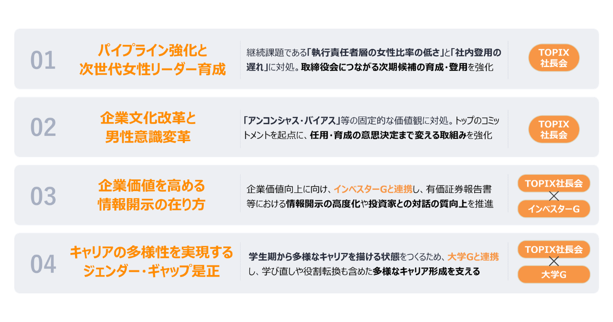 第2期活動成果として、2025年9月時点ではTOPIX100取締役会女性比率が25.3%、TOPIX社長会では27.3%と着実な上昇が見られた。しかし一方で、執行役員や上級幹部職など実務経営層への女性比率とのギャップや人材パイプラインの課題、アンコンシャス・バイアス、女性管理職比率停滞などの構造的な課題が残っている。これらを踏まえ、新たな重点テーマとして「パイプライン強化と次世代女性リーダー育成」「企業文化改革と男性意識変革」「企業価値向上を目指す情報開示」「キャリア多様性を実現するジェンダーギャップ是正」を掲げる。