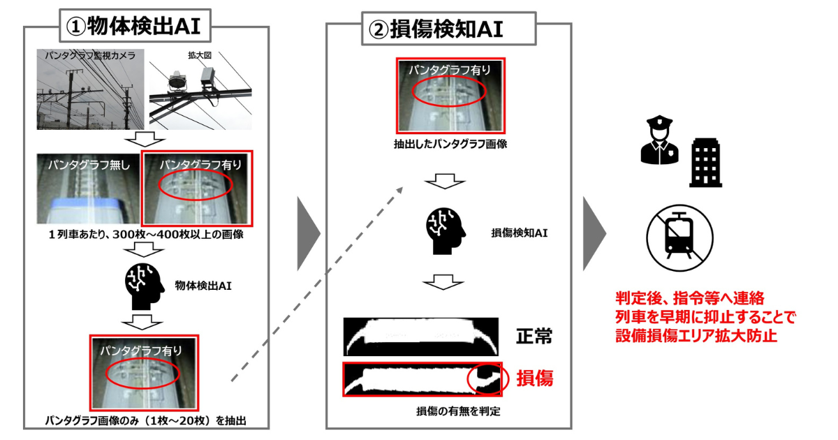 AI画像解析によるパンタグラフ監視カメラは、2026年4月より試行を開始。カメラで撮影した画像を、物体検出と損傷検知を行うAIで解析し、損傷箇所の早期抽出を可能とする。なお、この取り組みはJR東日本スタートアップとコーピーによる共同実施となる。