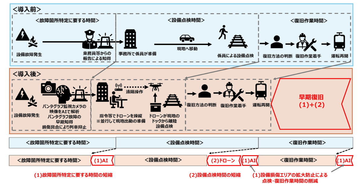 従来、設備故障が発生した際は現地まで出動し設備の状態を確認しないと、具体的な復旧方法や運転再開までの時間を判断できない課題があった。今回の取り組みでは、山手線にパンタグラフ監視カメラを設け、リアルタイムでAIによる画像解析を行いパンタグラフの異常を早期に検知する。同時に、遠隔操作かつ安全システムを搭載したドローンを用いて鉄道設備の点検を行う。これにより故障箇所の特定・点検の迅速化と、設備損傷拡大の防止効果を見込んでいる。