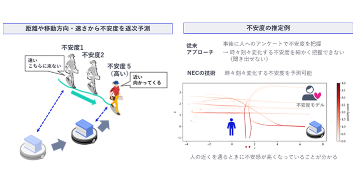 一方、不安推定モデルは、ロボットが人へ近づいた際に感じる不安感をアンケートなどで収集し、そのデータとロボットの走行パターンをAI学習させることで、実際の相対位置・姿勢・速度から不安の程度を定量推定できるようになっている。この結果、ロボットは最適経路や適切な走行速度を選択しながら、人の不安が高まらないように自律走行することが可能となる。