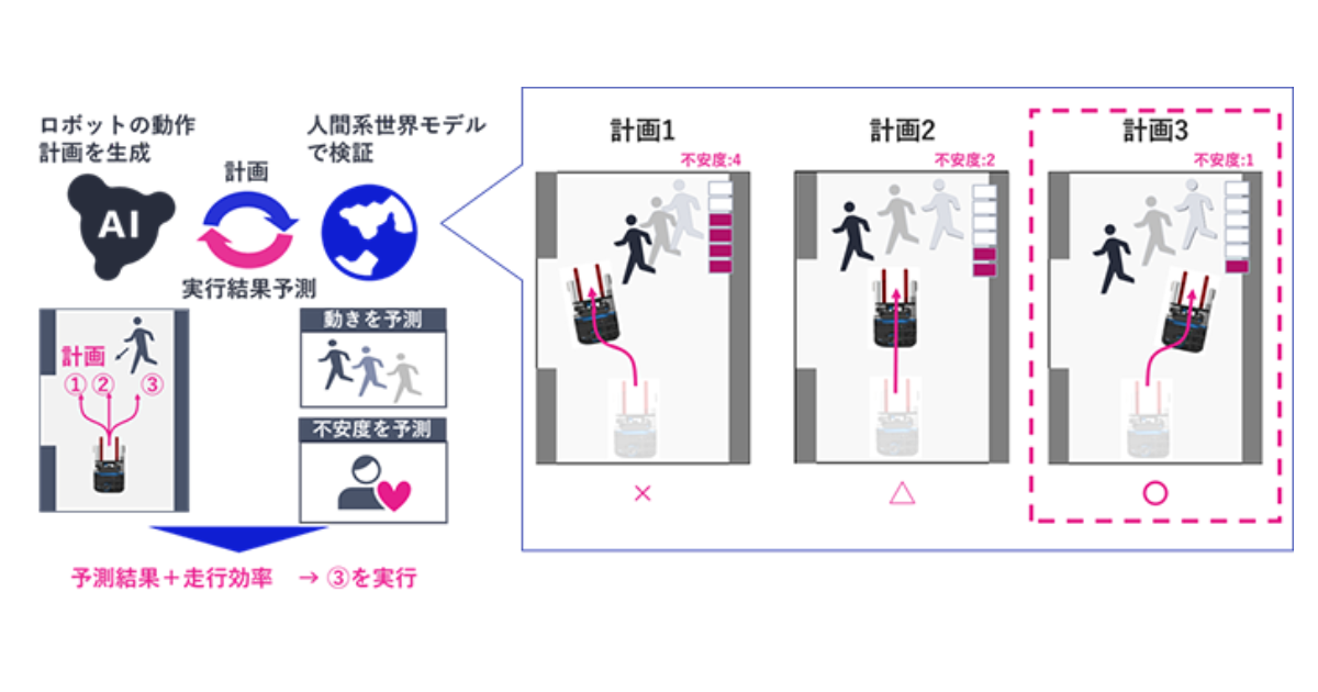 今回発表された技術の主な特徴は、二つの予測モデルによる「人間系世界モデル」を組み合わせた点にある。ひとつは、ロボットの挙動や物理的な周囲環境によって変化する人の動きを予測するモデルであり、もうひとつはロボットの接近によって生じる人の不安の程度をリアルタイムかつ定量的に推定するモデルである。