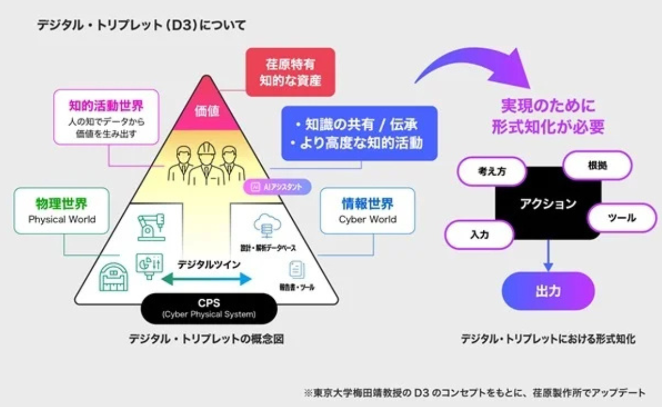 通常のデジタルツインが「物理空間」と「情報空間」から成るのに対し、「知識空間(形式知)」を加えた三層構造。現場のノウハウや暗黙知をデジタル空間と結びつけ、AIが知識を推論し継承する基盤となる。