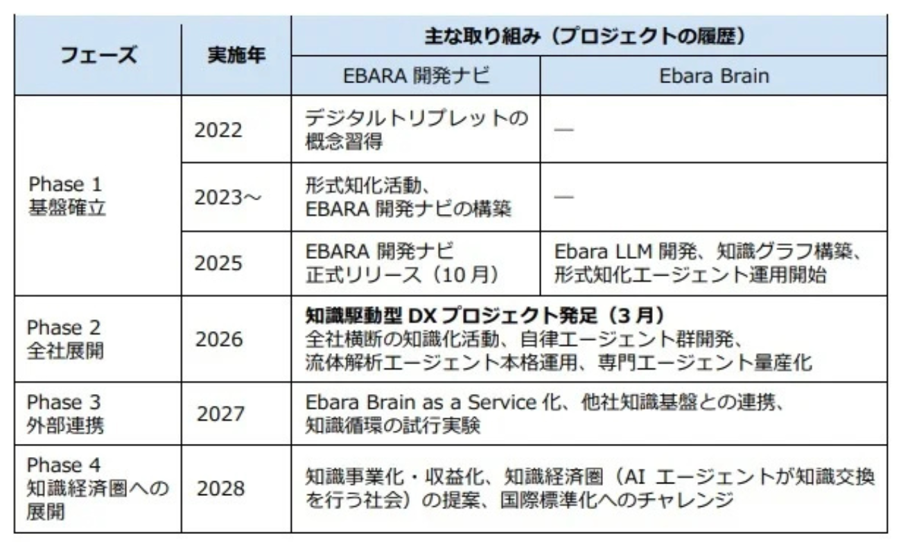 本プロジェクトは、東京大学梅田靖教授が提唱する「デジタルトリプレット」概念を基礎に、荏原独自開発の設計開発支援システム「EBARA 開発ナビ」と自律分散型AIエージェント基盤「Ebara Brain」を融合。知識を軸とした新たなものづくり知識基盤の構築を目指す。