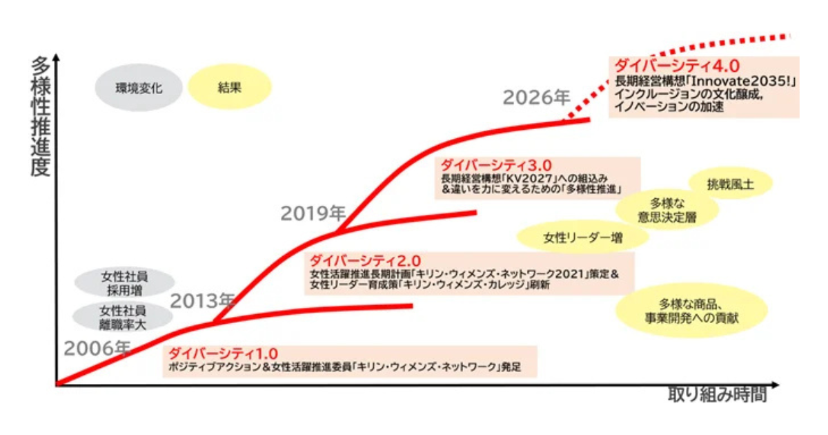 キリングループは「Innovate2035!」の長期経営構想を策定し、「人と技術の力でイノベーションを起こし続けるCSV先進企業」をビジョンに掲げている。その実現に向けて、グループ共通の価値観・行動指針である「KIRIN WAY」を策定し、中核理念として「違いを力に変える」を据え、組織改革を推進している。その一環として多様性を重視し、「女性活躍推進長期計画2030」を2022年に策定。女性経営職比率や育休取得促進などを具体策として展開する。