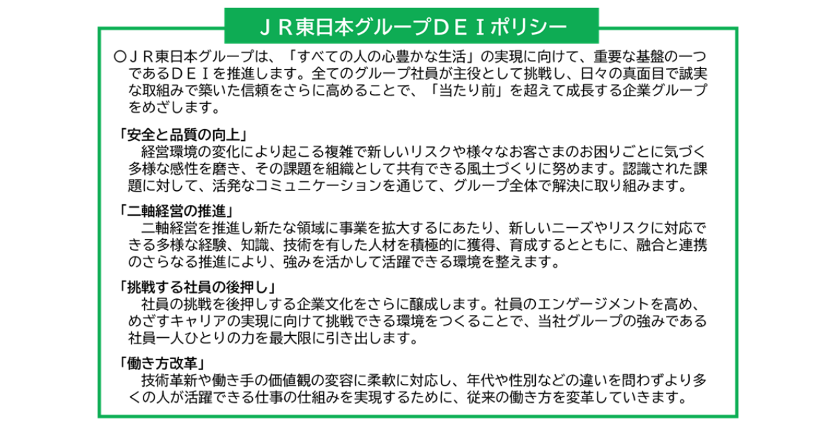 東日本旅客鉄道(JR東日本)グループは2026年3月27日、グループ経営ビジョン「勇翔2034」のもと、ダイバーシティ・エクイティ・インクルージョン(DEI)推進の基本方針となる「JR東日本グループDEIポリシー」を策定したと発表した。グループとしてDEIに関連した基本方針を掲げるのは初となる。