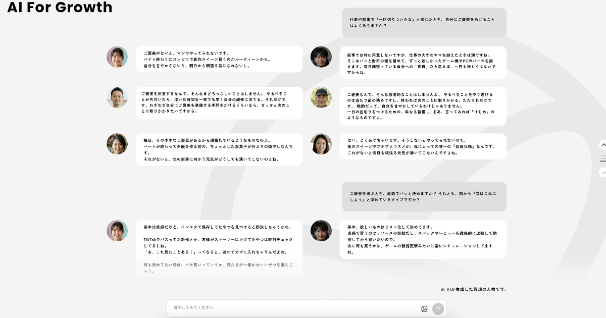 さらに、AI For Growth Talkではインタビュー機能も強化した。従来の1対1対話に加え、グループインタビューやペルソナ同士の会話モード、回答サマリー生成、会話テーマ設定(インサイト抽出、アイデア発散、討論、合意形成)が利用可能となり、仮説検証から施策立案・実行までの一連のサイクルを高速化できる。