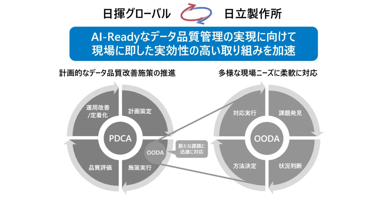 そこで日立は、日揮グローバルに対し、データ品質基準の設定、モニタリング、管理基盤の運用設計、データガバナンスの構築など、DQM実現に必要な仕組み作りを包括的に支援する。また、PDCAによる計画的な改善と、OODAによる迅速な対応を合わせた「PDCA×OODA」型の改善プロセスを採用し、継続的かつ柔軟なデータ品質管理体制の構築・定着化を目指す。