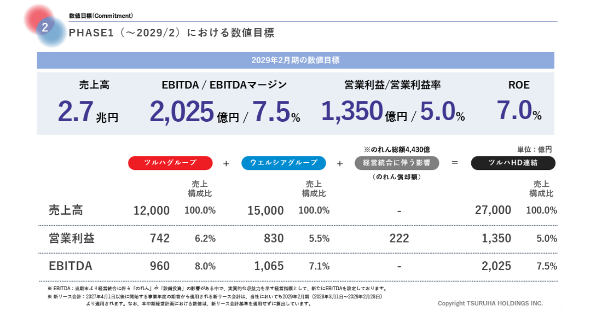 新たな中期経営計画では、2029年2月期に向けた数値目標も設定。最重要指標とするEBITDAについては、計画期間の先行投資を意識し2,025億円を掲げた。また、最終年度に売上高2.7兆円、EBITDAマージン7.5%、営業利益1,350億円(営業利益率5.0%)、ROE7.0%の達成を目指す。今後は経営統合による資本効率向上も重視し、ROEも主要な経営指標に据える。