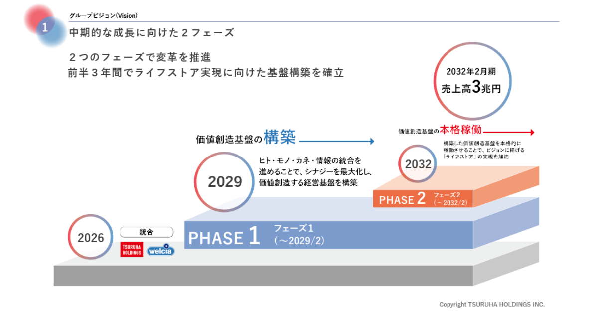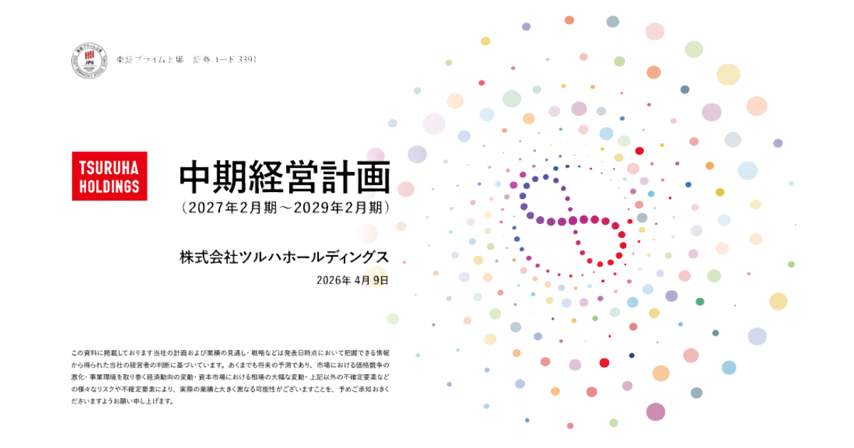 ツルハホールディングスは2026年4月9日、2027年2月期から2029年2月期を対象とする新たな中期経営計画の策定を発表した。激変するドラッグストア市場に対応し、経営統合により構築された国内最大規模の店舗網や幅広い商品ラインナップ、蓄積した顧客データなどの強みを基盤に、「顧客起点のネットワーク」への進化を明確にするとしている。
