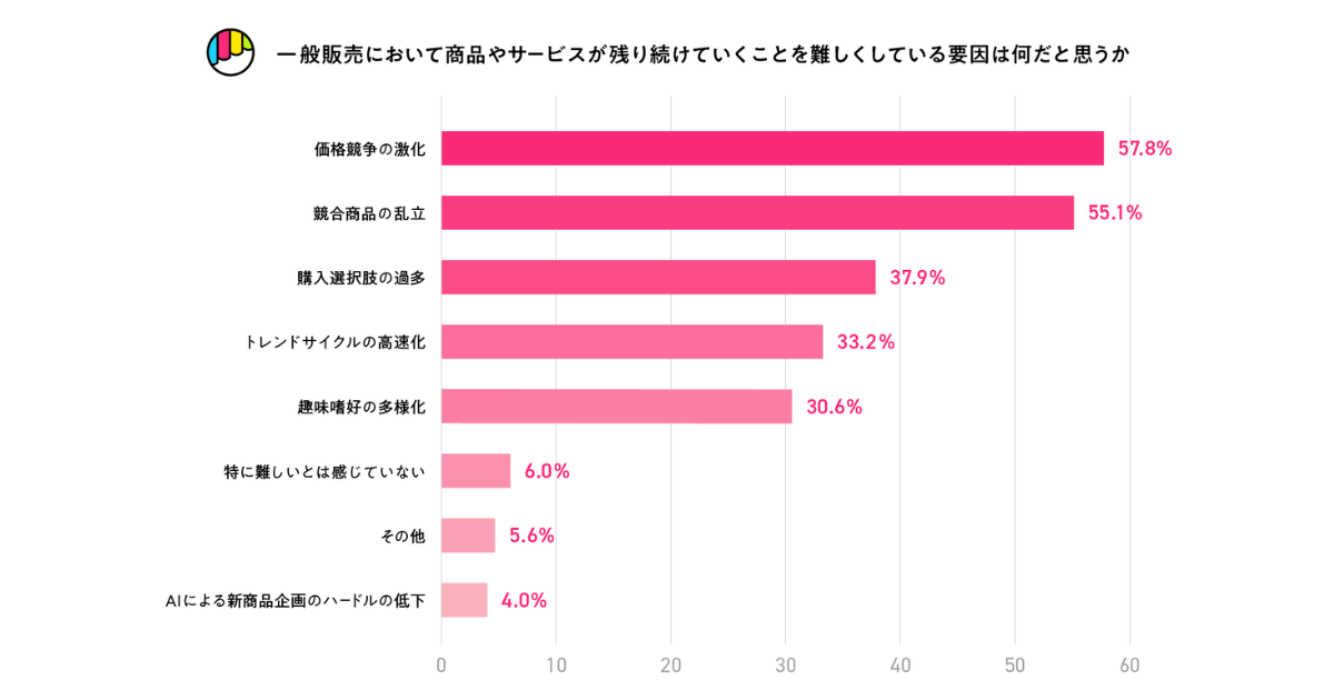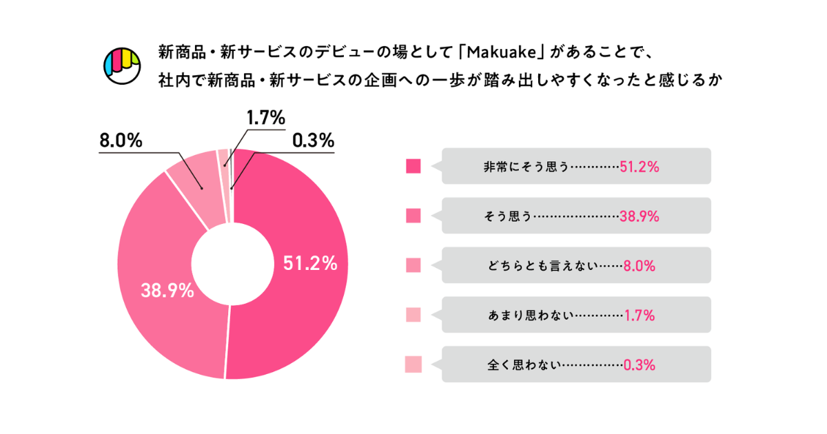 2026年3月に実施したアンケート調査では、304名の実行者のうち約9割が「Makuake」があることで新商品企画に踏み出しやすくなったと回答した。一方で、一般販売市場における長期的な事業継続の課題としては「競合商品の乱立」「価格競争」「購入選択肢の過多」「トレンドサイクルの高速化」などの声が上がった。また、「AIによる新商品企画のハードルの低下」に関しては、1割以下の実行者が影響を感じているのみだった。