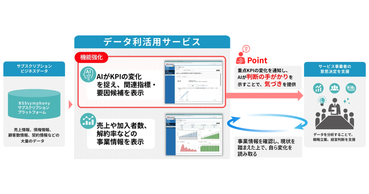 従来、「BSSsymphony」は売上や加入者数などのKPI管理・可視化機能をダッシュボードとして提供してきた。新機能により、ダッシュボード自体も刷新され、AIによる統計分析が組み込まれたことで、ユーザーは重点KPI(解約率、顧客生涯価値、平均契約期間、収益の再発率など)の進捗状況をグラフで把握しつつ、変化時にはAIから関連指標や要因まで含めて自動的に示唆される。これにより、担当者はKPIの変動を素早く把握し、必要なマーケティングや業務施策を迅速に立案・実施できる。