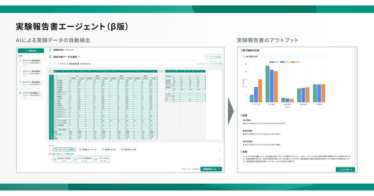 「実験報告書エージェント」はExcelの実験データを取り込み、AIが対話形式で不足情報を補完し、体裁の整った報告書を自動生成する。これにより、資料作成の工数削減を実現し、研究者が実験や考察に集中できる環境が整う。また、報告書の品質と粒度を標準化することで、ナレッジの再利用性と組織的な資産化を促進する。